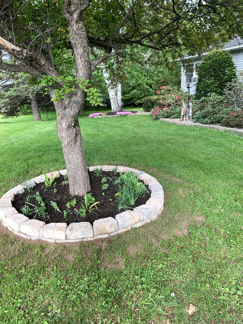 Those two pallets of landscape blocks - GONE! or maybe I should say used for their intended purpose. I purchased 3 pallets of blocks years ago to separate the plantings, shrubs from the lawn. Hired Jason D. to place them and then winter blew in That was years ago. The surround was almost done there again, two spots were left unfinished. That seems to be the recurring theme around here. Anyways, his employee Cal W. did the most of the work.